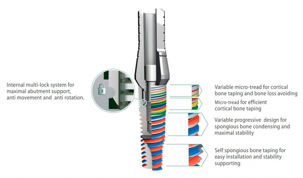 Винтовой конический самонарезающий титановый имплантат с внутренним шестигранником 2.43ммд. За счет уникальной меняющейся резьбы и микрорезьбы дает хорошую первичную фиксацию имплантата и предупреждает резорбцию кости вокруг имплантата. Конструкция внутреннего шестигранника позволяет фиксировать абатмент в 3-х проекциях и не позволяет подвижности абатмента при раскручивании винта абатмента. Применяется во всех видах кости. Наилучшие результаты в кости 1 и 2 типа. Зоны имплантации – все отделы верхней и нижней челюсти. Возможна одномоментная функциональная нагрузка на имплантат.
