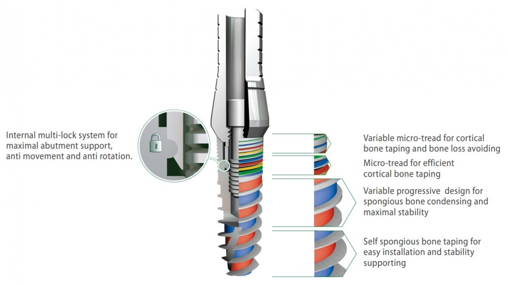 Винтовой выраженный конический самонарезающий титановый имплантат с внутренним шестигранником 2.1ммд и 2.43ммд. За счет уникальной меняющейся резьбы и микрорезьбы дает хорошую первичную фиксацию имплантата и предупреждает резорбцию кости вокруг имплантата. Конструкция внутреннего шестиграника 2.43ммд позволяет фиксировать абатмент в 3-х проекциях и не позволяет подвижности абатмента при раскручивании винта абатмента. Применяется во всех видах кости. Наилучшие результаты в кости 2,3 и 4 типа. Зоны имплантации – все отделы верхней и нижней челюсти. Наилучшие результаты при методиках с одномоментной функциональной нагрузкой на имплантат и при непосредственной (иммедиат) имплантации.