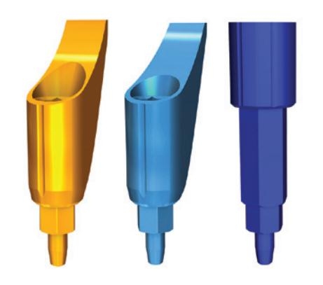 Комплект состоит из 3-х элементов, изготовленных из сплава титана, являющихся аналогами стандартных замковых титановых и цирконеевых абатментов: